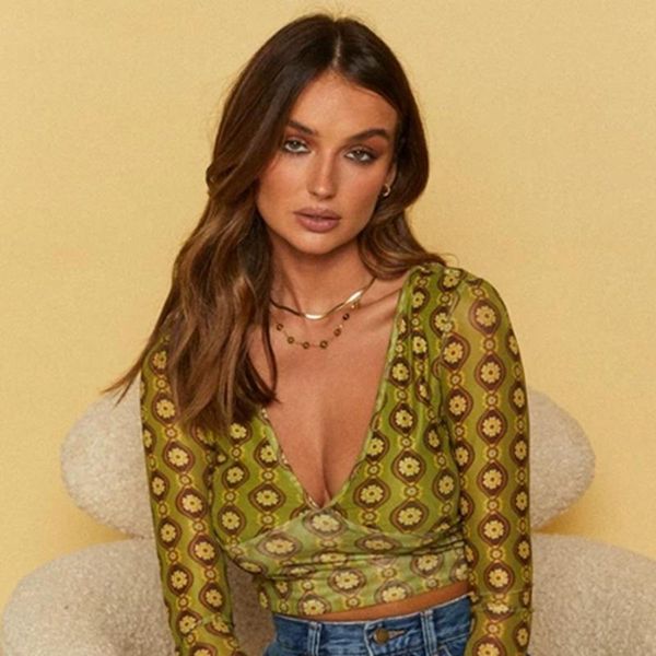 women's t-shirt crop floral print deep v-neck long-sleeved halter neck 2021 summer autumn personality fashion high street green, White