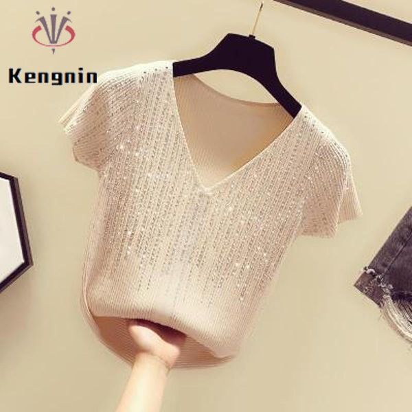 women's t-shirt diamonds knitted women sweater tees 2021 summer v-neck ladies short sleeve female harajuku pullovers ks62, White