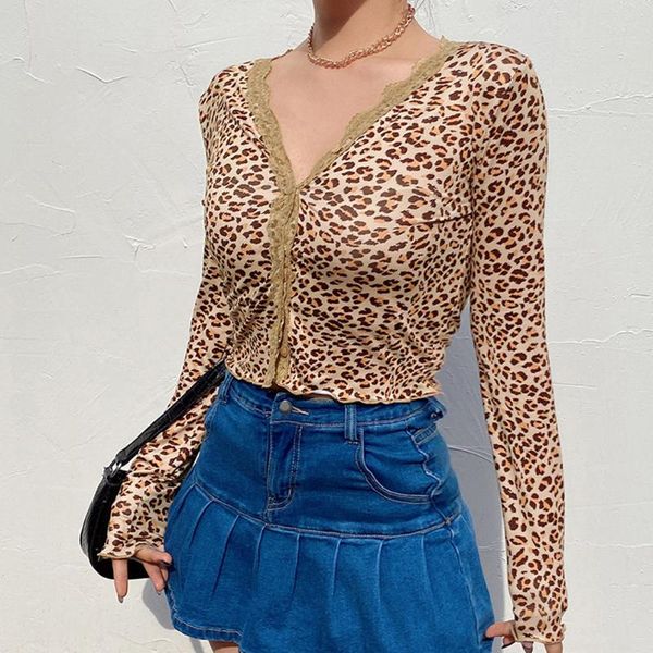women's t-shirt female leopard print harajuku tee shirts lace patchwork long sleeve v neck party autumn fashion thin streetwear casual, White