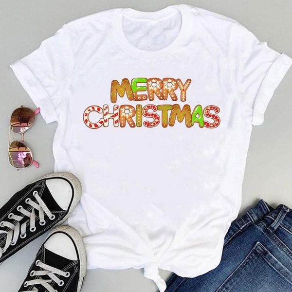 women's t-shirt holiday merry christmas letter cute 2022 women o-neck t-shirts clothes graphic cartoon female sweet year tshirt tee, White