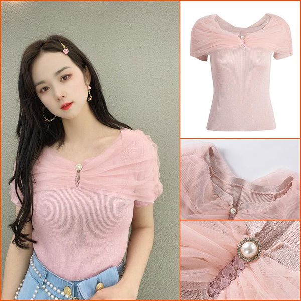 women's t-shirt mesh folds pleats patchwork short sleeve knitted t shirt women princess summer tee femme camiseta feminina party, White