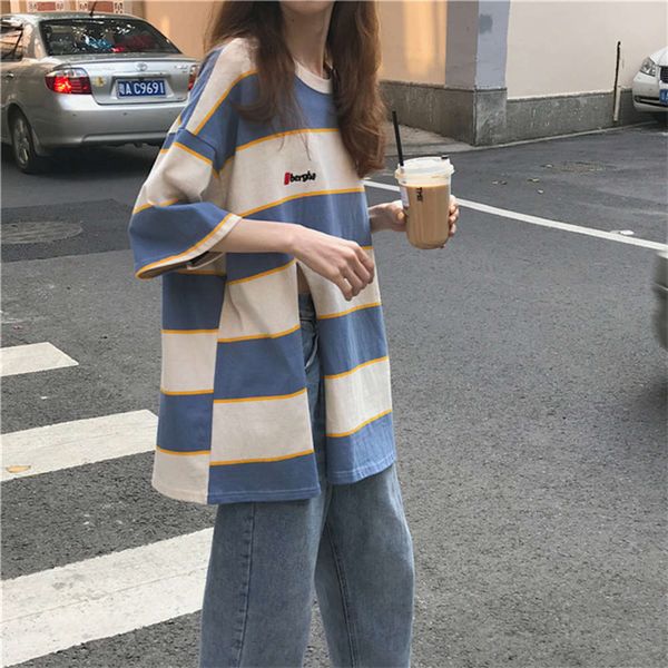 women's t-shirt net red ins super fire stripe short sleeve summer korean fashion loose split high waist prfv, White