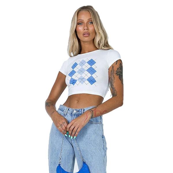 women's t-shirt plaid t shirt women round neck navel slim short sleeve 2021 spring summer fashion white blue tight feminina ld1608