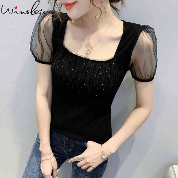 women's t-shirt summer european clothes cotton pullover fashion diamonds patchwork mesh women sleeve tees 2021 t14805a v, White