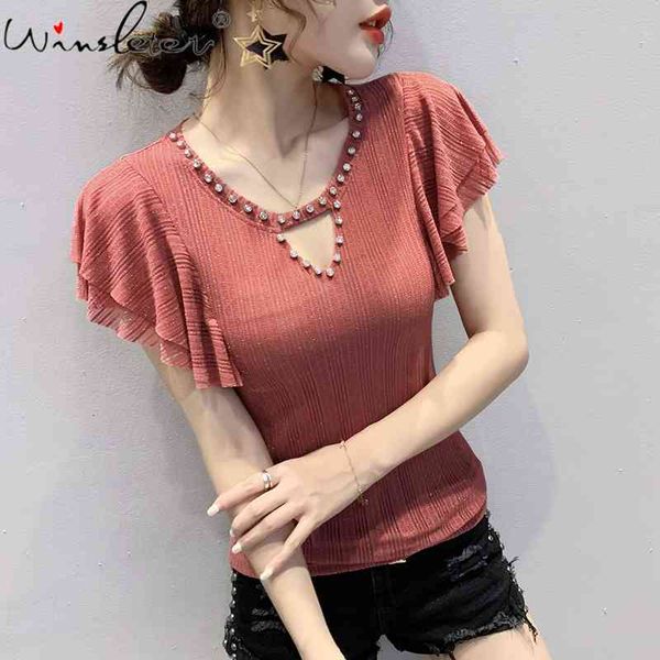 women's t-shirt summer european clothes fashion hollow out shiny beading women short sleeve ruffles slim tees t13604a 36, White