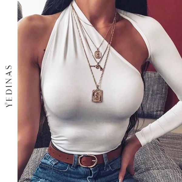 women's t-shirt yedinas 2021 women open back long sleeve one shoulder harajuku for girls korean skinny tee hollow out, White