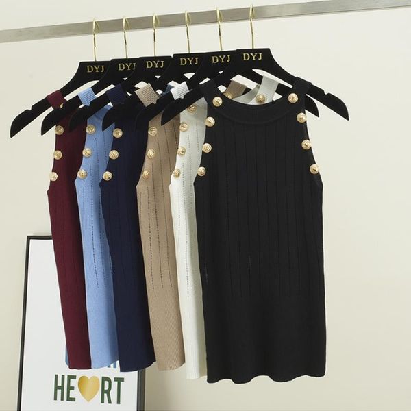 women's tanks & camis women soild color button hollow out knitted tank female girls double breasted knit sleeveless sweater, White