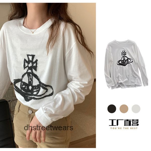 women's tee shirts western vivian westwood saturn t-shirt female 2022 autumn new embroidered planet sunscreen shirt round neck pullover, White