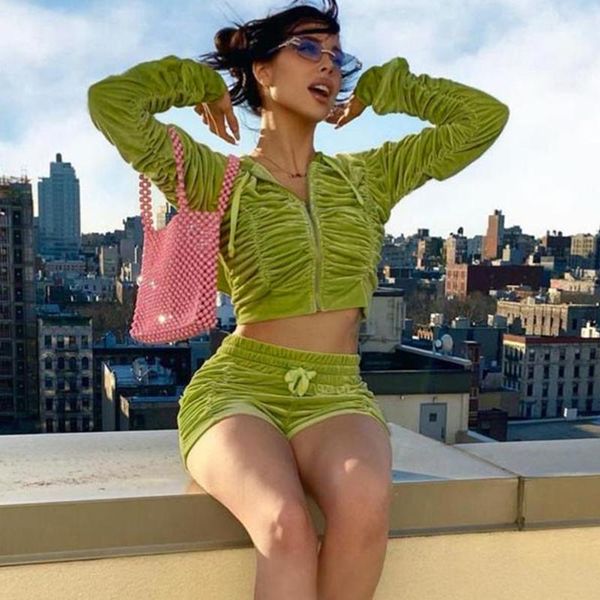 women's tracksuits 2021 winter fall solid casual street women sports suit bodycon long sleeve ruched zip slim hooded short pants 2 piec, Gray
