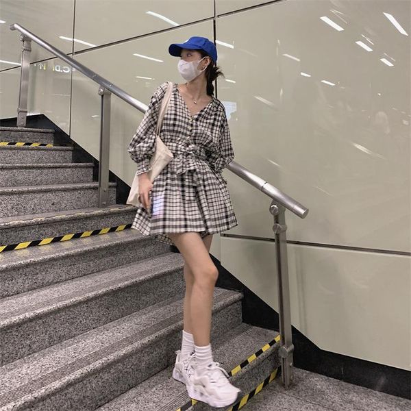 women's tracksuits autumn plaid shirt dress fashion print v-neck belt blouse office lady long sleeve female wide leg short pants outfit, Gray