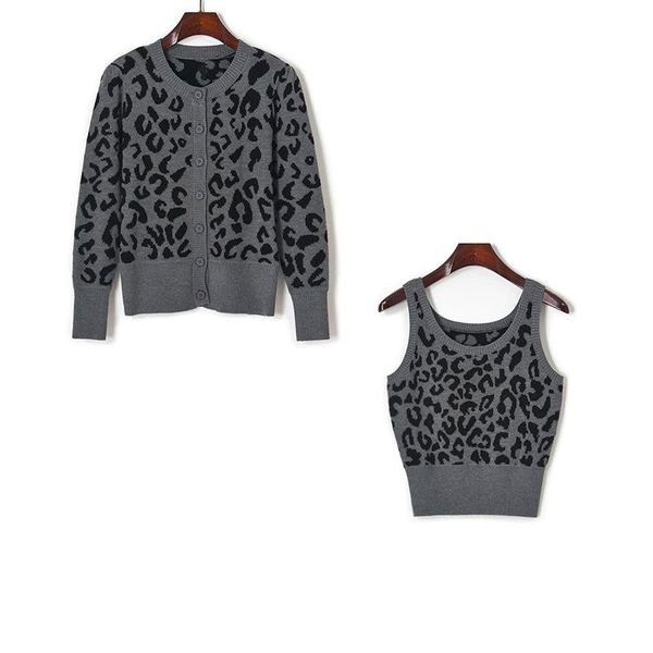 women's tracksuits cardigan and vest 2 piece set women 2021 autumn o neck leopard jacquard knit + crop sweater outfits for, Gray