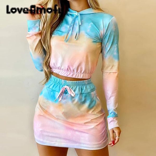 women's tracksuits causal women sets tie-dye fashion female suit hoodie crop + short skirt sportswear 2 piece set streetwear 2021, Gray