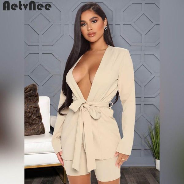 women's tracksuits fall matching sets women suit full sleeve bandage sashes v-neck blazers high waist stretchy shorts 2 two piece set o, Gray