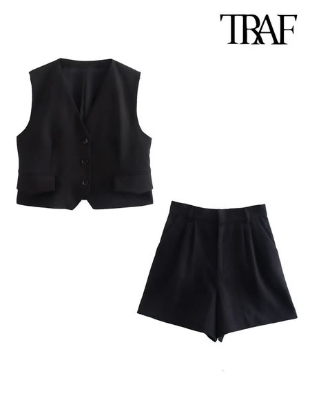 women's tracksuits traf women fashion front buttons waistcoat and high waist bermuda shorts female two pieces sets mujer 230413, Gray