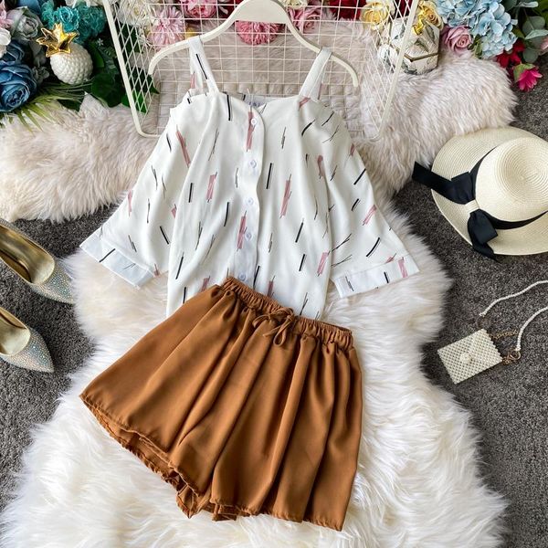 women's tracksuits women two pieces suits vertical stripes button slash neck camis+solid stretch waist wide leg shorts fashion, Gray