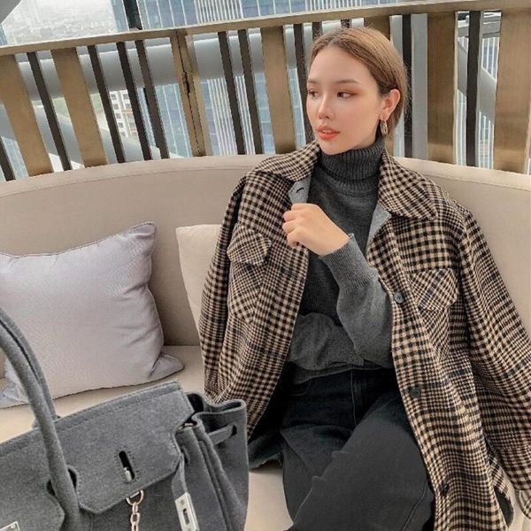 women's trench coats 2021 autumn and winter lapel british check lace-up profile loose double-sided cashmere coat jacket women, Tan;black