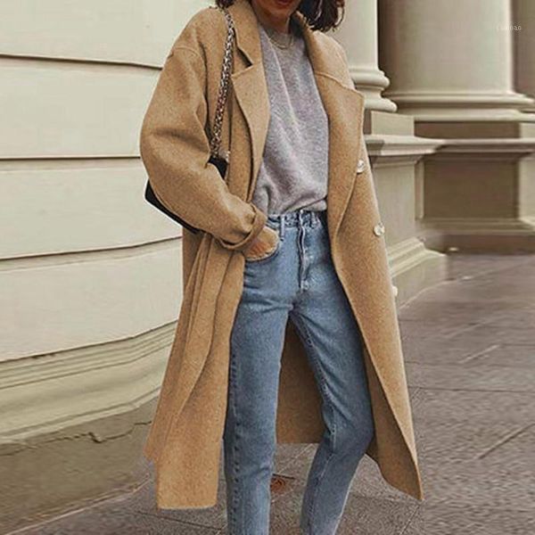 women's trench coats women solid woollen coat autumn winter fashion long sleeve lapel neck pockets jackets female plus size slim button, Tan;black