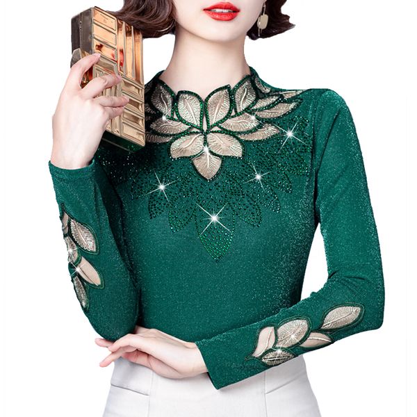 women's tshirt m4xl elegant lace shirt autumn winter drilling longsleeved tshirt flowers mesh blusa 230110, White