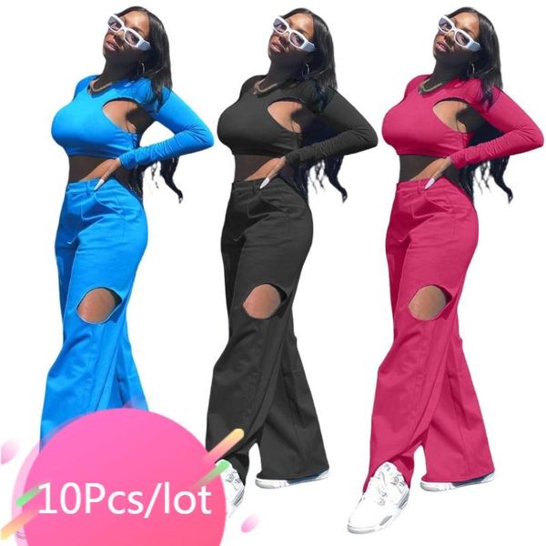 women's two piece pants bulk item wholesale lots fall outfits for women long sleeve hollow out crop and pant set y2k clothes street st, White