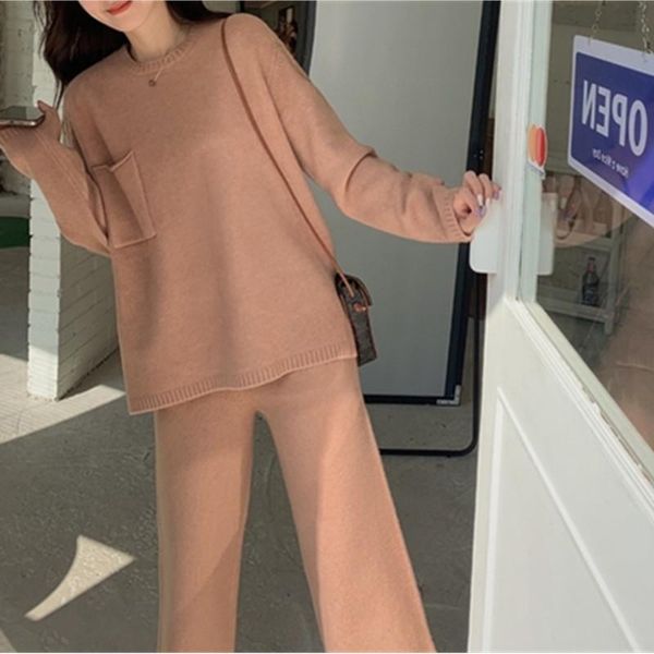 women's two piece pants elegant knitted tracksuit o-neck pocket split pullovers sweaters + elastic waist wide leg set outfit, White