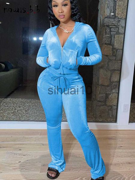 women's two piece pants nowisbb velvet tracksuit fashion 2 piece set zipper pocket sporty hoodies sweatshirt + straight pant two piece, White