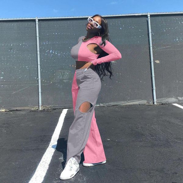 women's two piece pants spliced sets fall clothes for women hollow out long sleeve crop casual bell bottom streetwear 2021, White
