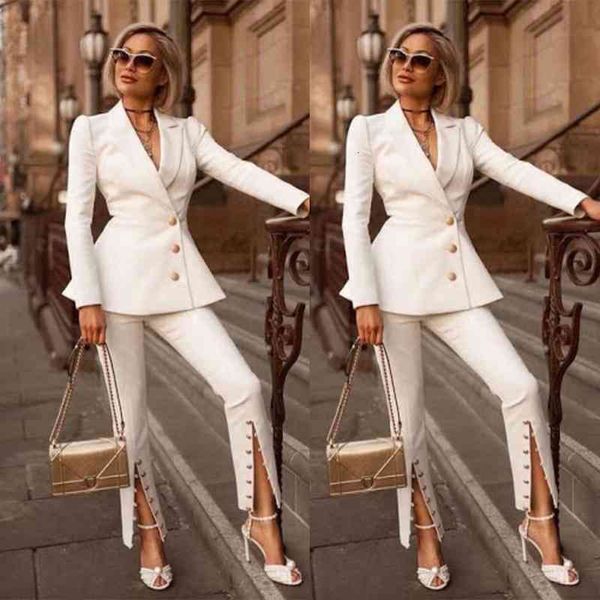 women's two piece pants spring/autumn women suits slim fit double breasted jacket with smoking blazer mother or bride dress ladies busi, White