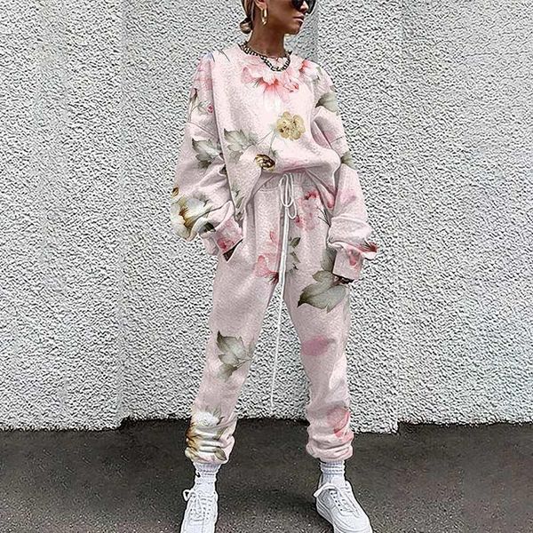 women's two piece pants women floral set long sleeve fleece tracksuit female 2021 autumn winter printed ladies o-neck streetwear fashio, White