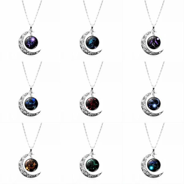 women 12 zodiac sign pendant moon necklaces cabochon gemstone constellation necklace charm chain jewelry fashion accessories, Silver