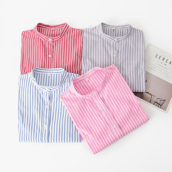 women blouses 2020 autumn new simple casual blue red striped long sleeve shirt female stand collar plus size blouse blusas, White
