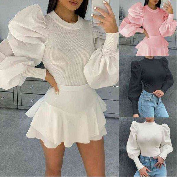 women blouses ladies puff sleeve pullover o neck sweater blouse autumn spring long knitted slim fit jumper, White