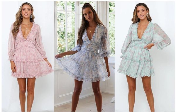 fashion short dress women's new ruffle v-neck floral cake skirt lantern sleeve, pink, green, blue, s, m, l, xl, chiffon