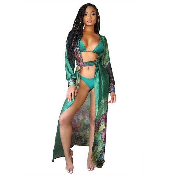 women chiffon kimono cardigan floral printed long sleeve summer beachwear cover up long swimsuit beach loose tunic sarongs pareo, Blue;gray