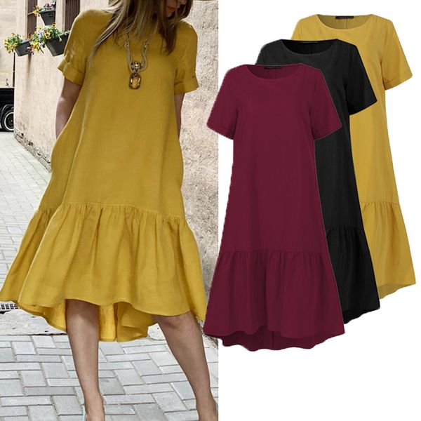 women dress holiday summer zanzea short sleeve sundress solid casual kaftan ruffles loose vestidos pockets o-neck robe femme 5xl, Black;gray