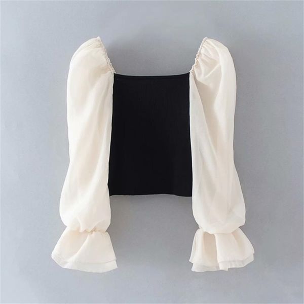 women elegant organza puff sleeve patchwork knitted casual smock blouse ladies chic square collar feminina shirt ls6464 220419, White