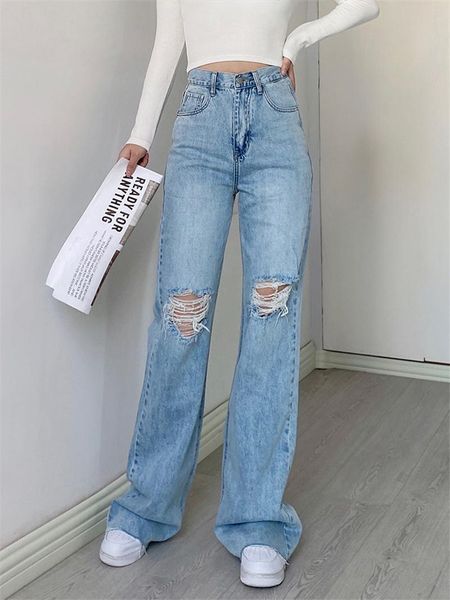 women european american retro wild loose thin high waist knee hole denim wide leg mopping straight micro pants women's jeans, Blue