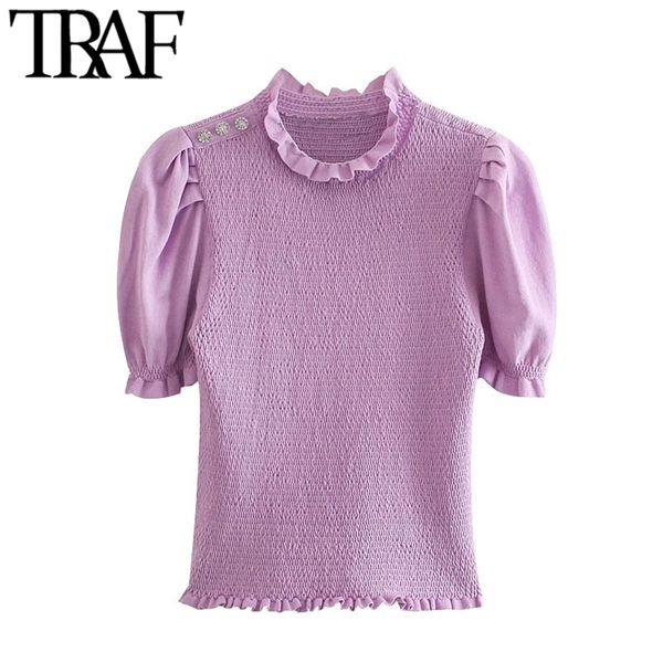 women fashion with buttons smocked elastic cropped knitted sweater puff sleeve ruffled female pullovers chic 210507, White;black
