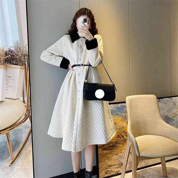 women french winter long temperament diamond lattice thick parkas dress velvet pearl button rhombus pattern vestidos 210519, Black;gray