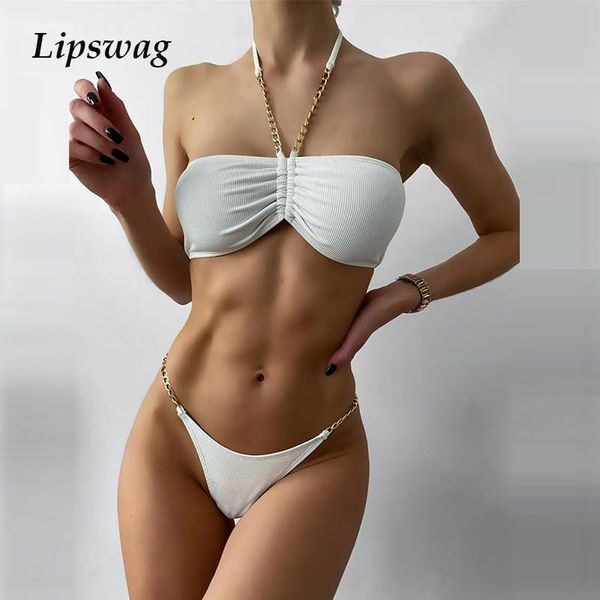 women halter metal chain solid swimwear bikini two piece bandage backless swimsuit female summer strapless beach wear suits one-piece