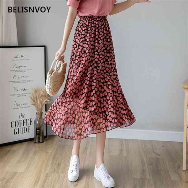 women irregular midi skirt floral printed chiffon ruffles female summer beachwear high waist bohemian a-line sweet long skirts 210520, Black