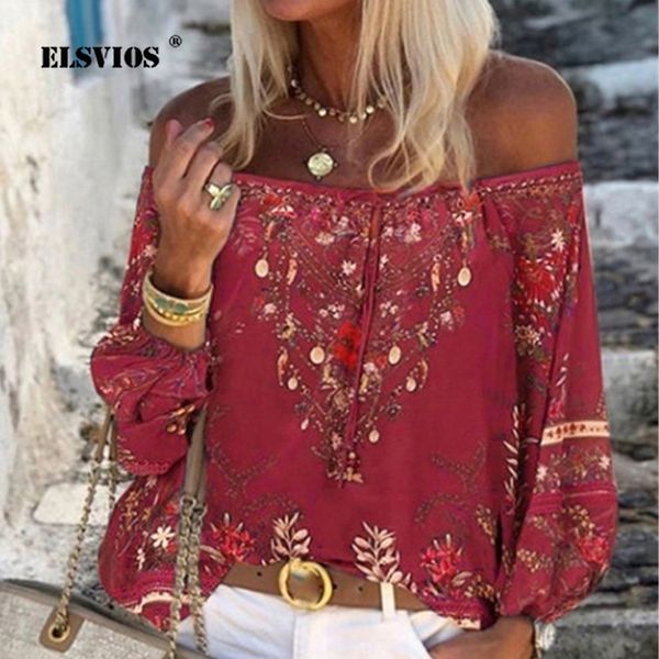 women off shoulder floral print blouse shirt summer retro hollow out lace-up blouses femme long sleeve patchwork streetwear y200828, White