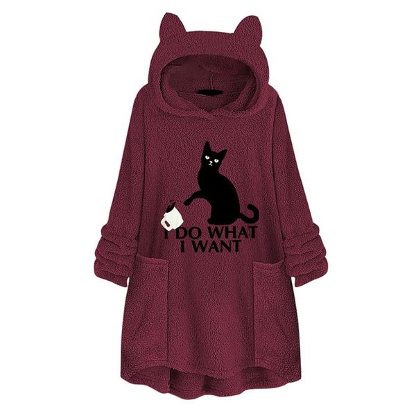 women plus size winter hoodies thicken plush hooded sweatshirt cute cat cartoon printed loose asymmetric hem tunic hoodies fashion, Black