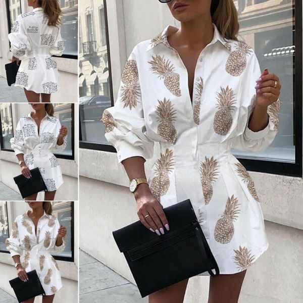women print mini blouse long sleeve belted casual button turn down neck blouse shirt, White