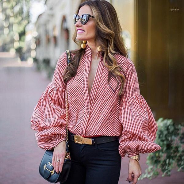 women puff sleeve blouse 2020 fall single-breasted v-neck long sleeve loose blouse casual shirt plaid female clothes1, White