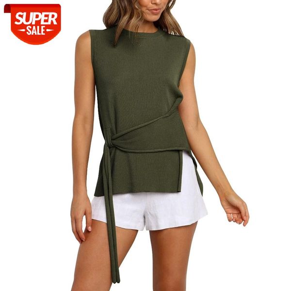 women rib knit t-shirt summer elegant o-neck sleeveless bandage decor low split ladies vest casual solid slim pullover #0c6n, White