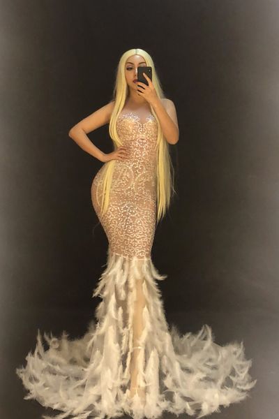 women see through mesh rhinestones dress evening birthday party celebrate feather dress singer costume long net yarn dress, Black;red