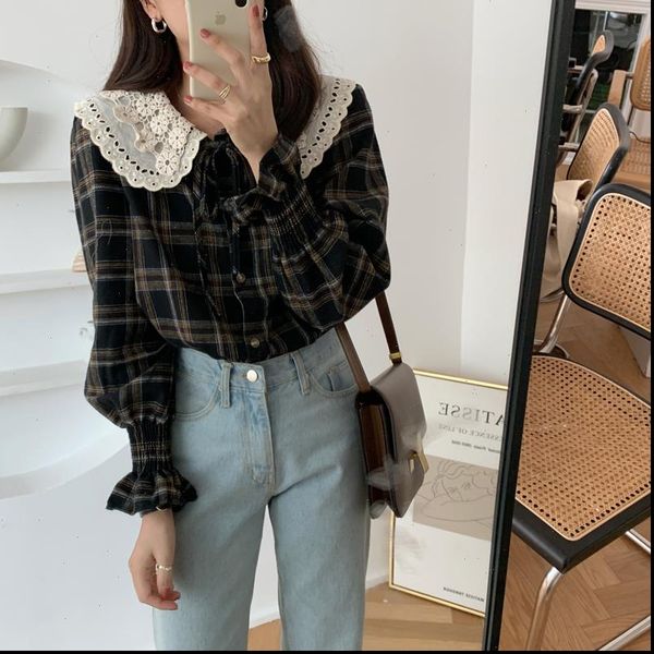 women shirt autumn plaid fashion korean peter pan collar long sleeve casual loose retro shirts sweet elegant blouses, White
