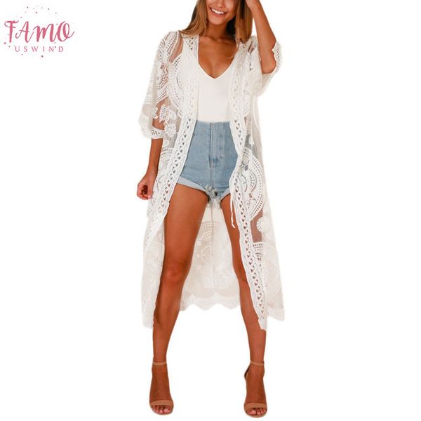 women solid cardigan beachwear blouse beach boho white lace hollow out lace half sleeve sunscreen long blouse clothing 5$