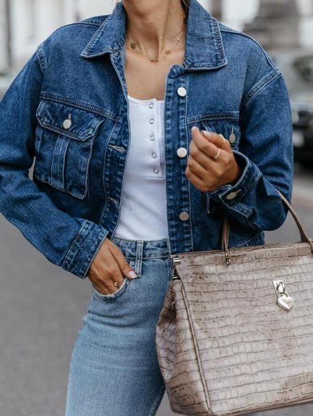 women solid short denim jacket boyfriend turn down collar overcoat streetwear button long sleeve pocket jeans coats, Black;brown