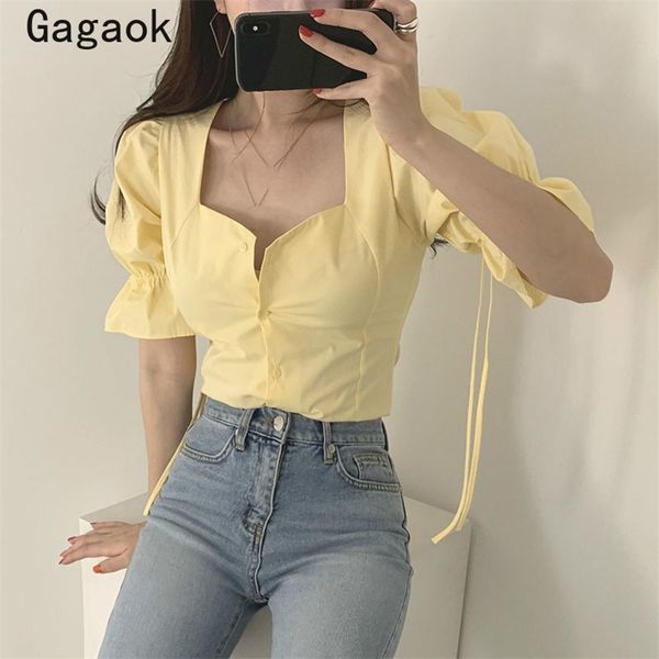 women streetwear shirt summer solid square collar navel lace up slim chic wild back stretch fashion 210531, White